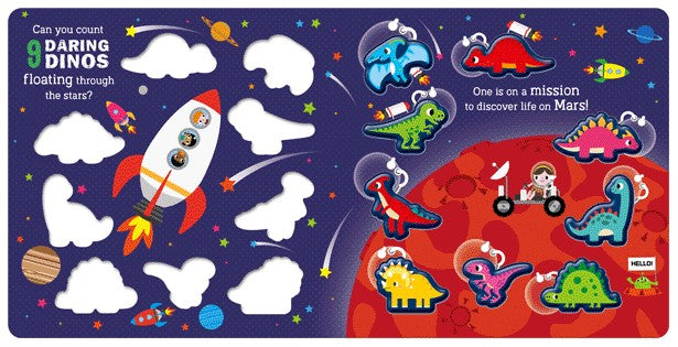 Dimensions:  210 x 210 x 15 mm Number of pages:  24 Description:  Practice counting down from ten with the daring dinos! This busy board book has ten dinosaur-shaped blisters that disappear one by one with the turn of each page. From skateboarding to swimming, there’s plenty for little ones to explore! Format:  Board Book / Silicone